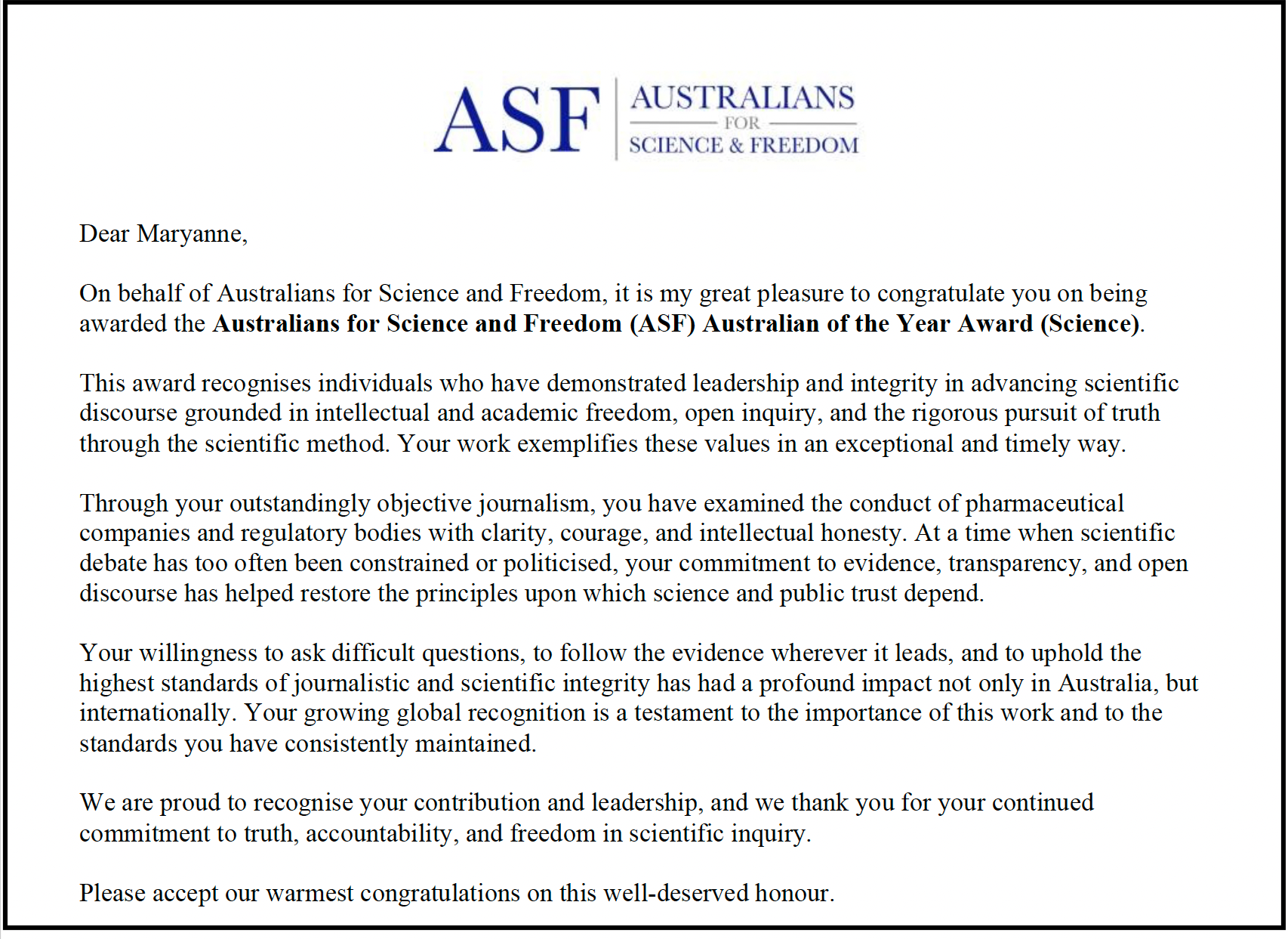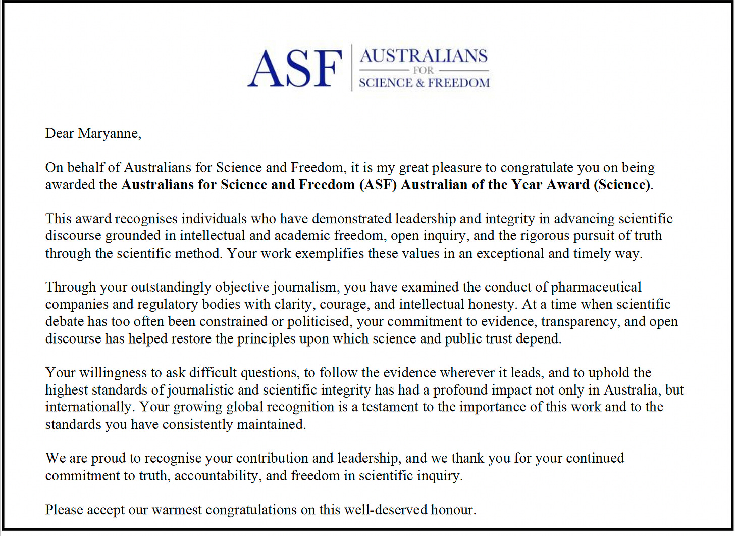 I was honoured to receive this year’s Australians for Science and Freedom Award for Science.