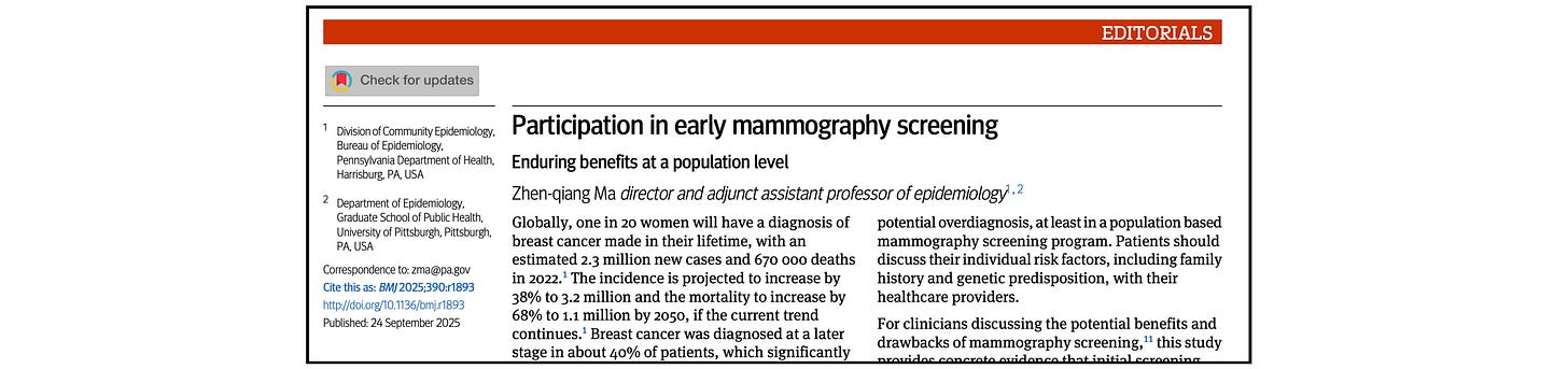 A recent BMJ editorial repeated that claim, declaring that mammograms “can detect breast cancer early, often before a lump can be felt,” and urging women to view their first screening appointment as “a long-term investment in breast health and survival.”