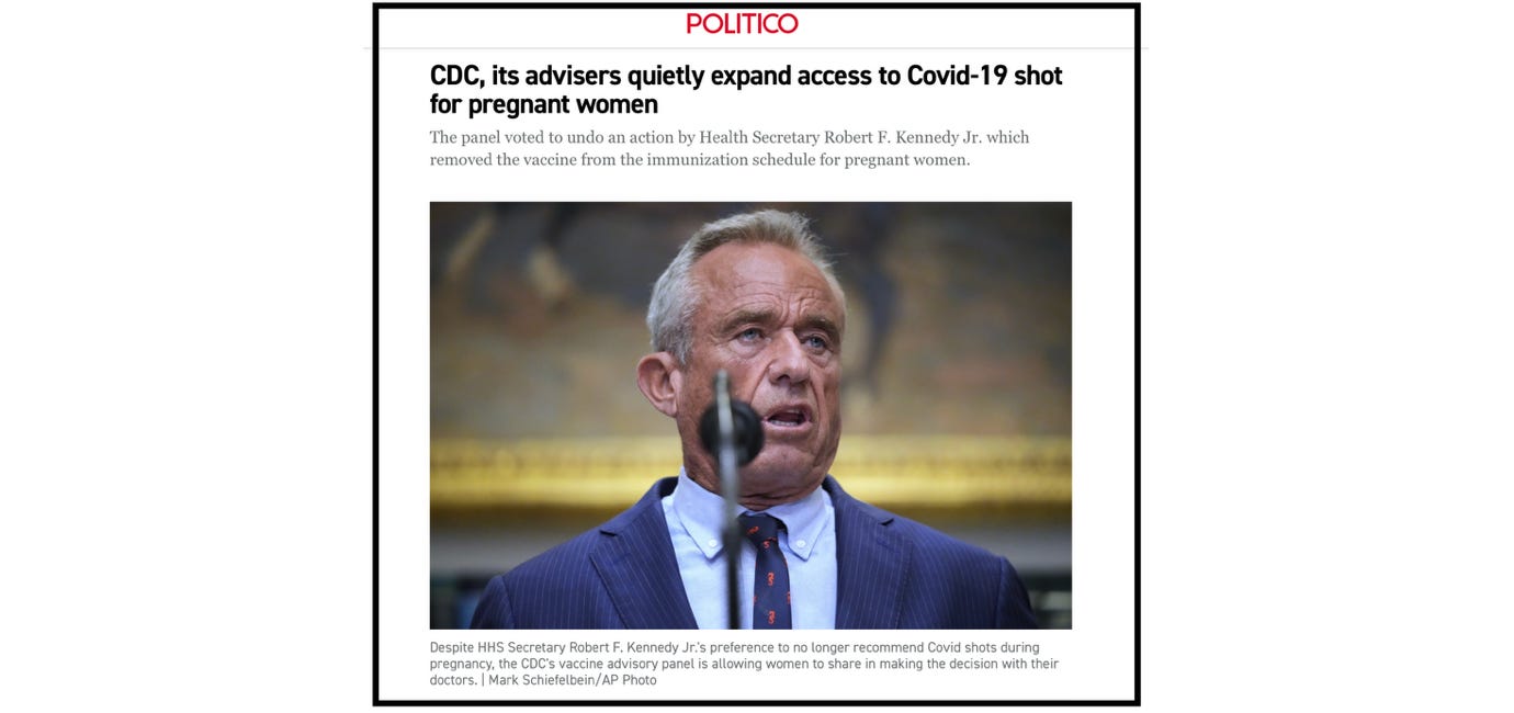 The article went further, asserting that the CDC and ACIP had “quietly opened the door to wider access … softening an earlier decision by Health Secretary Robert F. Kennedy Jr. to stop recommending that pregnant women get the shots.”