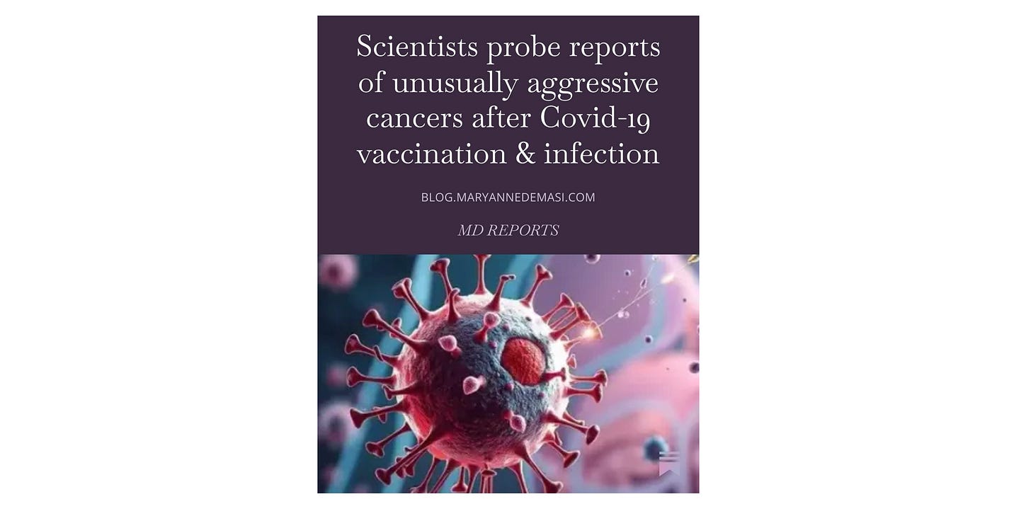 Playback speed×Share postShare post at current timeShare from 0:000:00/0:0091715Scientists probe reports of unusually aggressive cancers after Covid-19 vaccination & infectionMaryanne Demasi, PhDJan 05, 202691715ShareFULL STORY: MD REPORTS is a reader-supported publication. To receive new posts and support my work, consider becoming a paid subscriber.SubscribeGive a gift subscriptionGet 10% off a group subscriptionDiscussion about this videoCommentsRestacksMD REPORTSSubscribeAuthorsMaryanne Demasi, PhDRecent PostsAmerica rewrites the childhood vaccine schedule6 hrs ago • Maryanne Demasi, PhDHappy New Year 2026Jan 4 • Maryanne Demasi, PhDSenator Alex Antic in conversation with Dr Maryanne DemasiAug 14, 2025 • Maryanne Demasi, PhDPandemic Panic: Are Outbreaks Really on the Rise?Mar 20, 2025