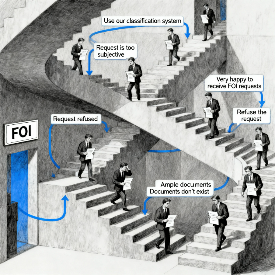 The FOI process has come to resemble an Escher drawing – a staircase that appears to lead somewhere but ultimately goes nowhere. This is our lived experience across nearly 1,400 days of trying to verify basic regulatory oversight.