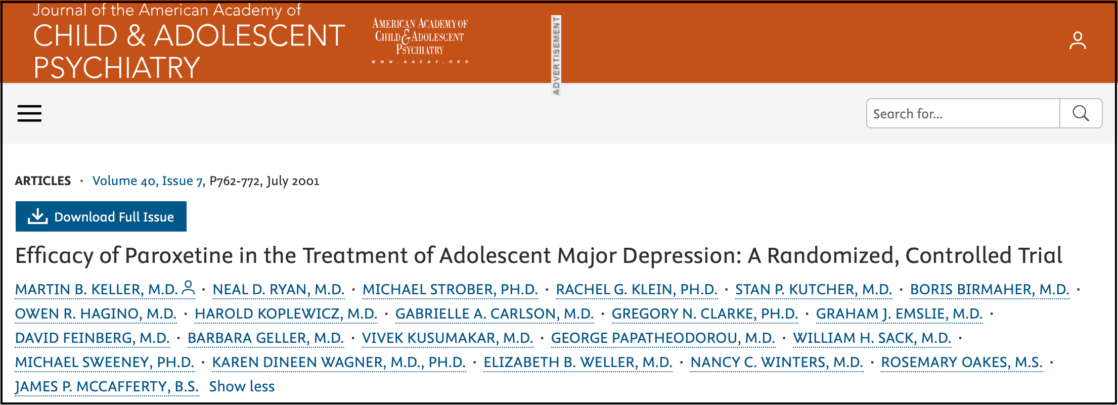 The 2001 article — Efficacy of Paroxetine in the Treatment of Adolescent Major Depression, by Keller et al. — claimed, “Paroxetine is generally well tolerated and effective for major depression in adolescents.”