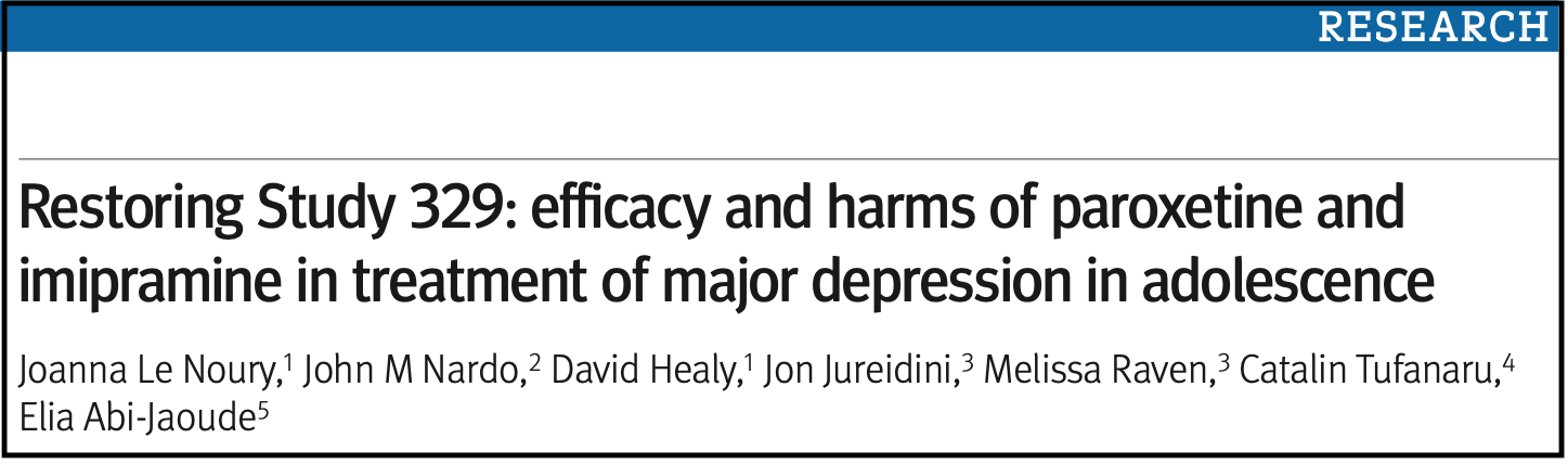 That reanalysis found that Paxil was no better than placebo and that adverse events — including suicidal ideation and behaviour — were grossly underreported.