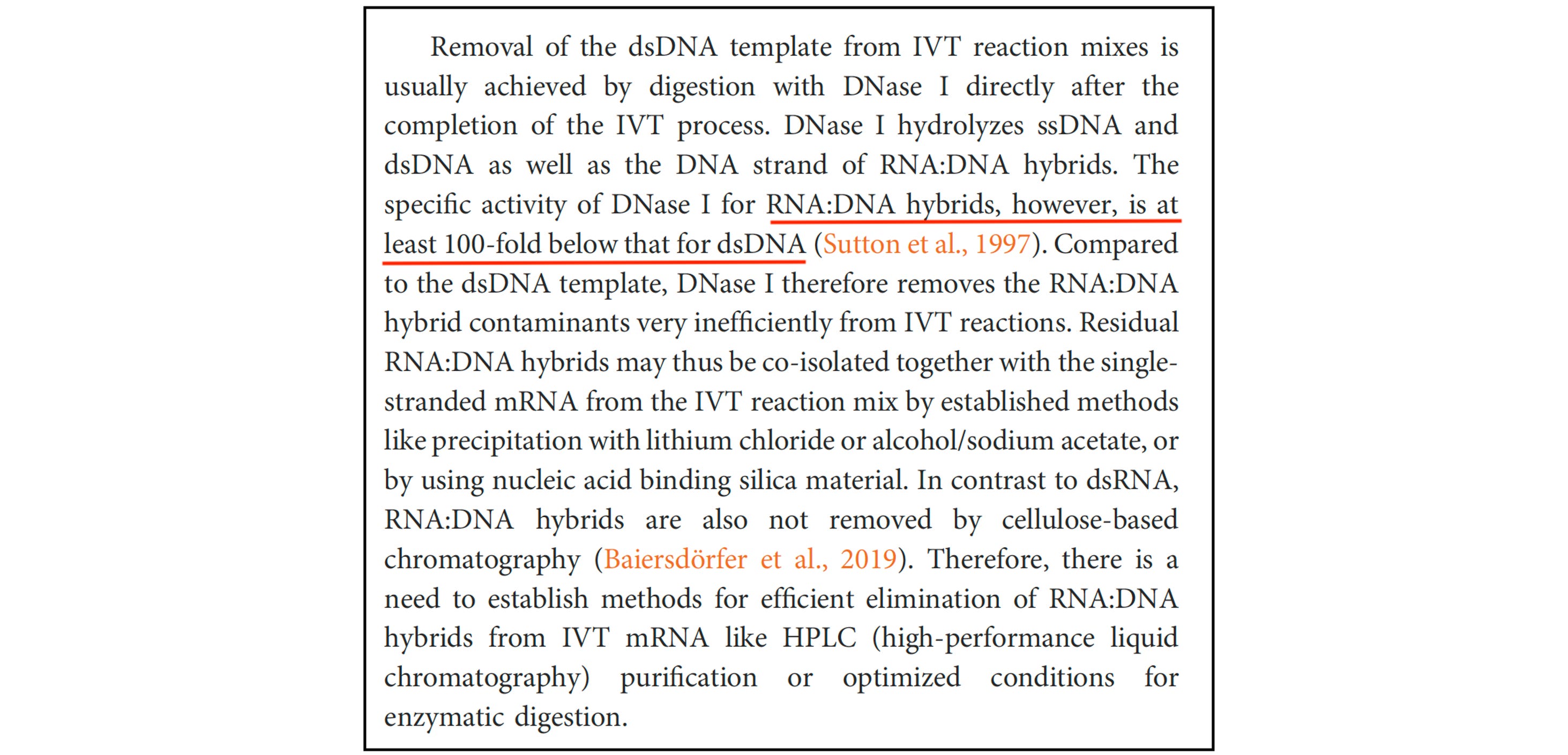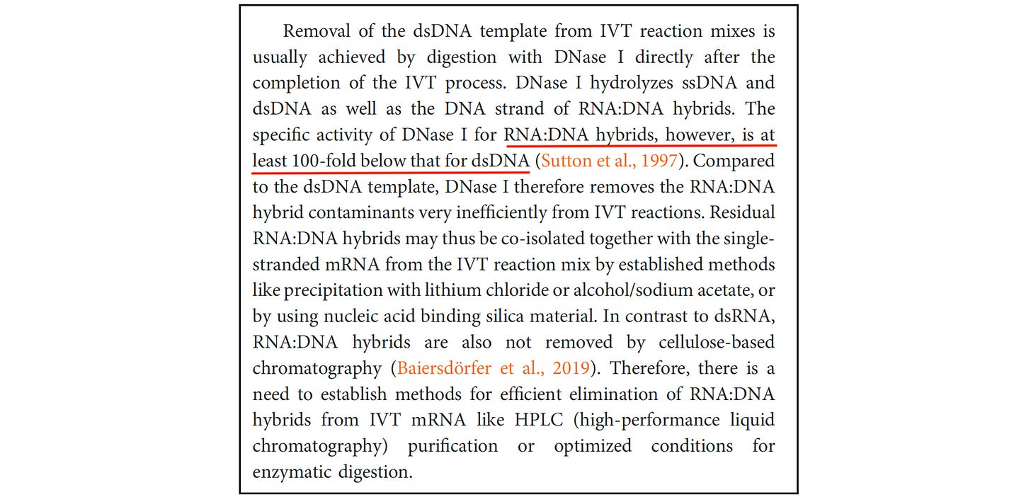 Even BioNTech — the company that partnered with Pfizer — has acknowledged the limitation. In a technical review, the company noted that DNase I is at least 100 times less effective at degrading RNA-DNA hybrids than ordinary double-stranded DNA.